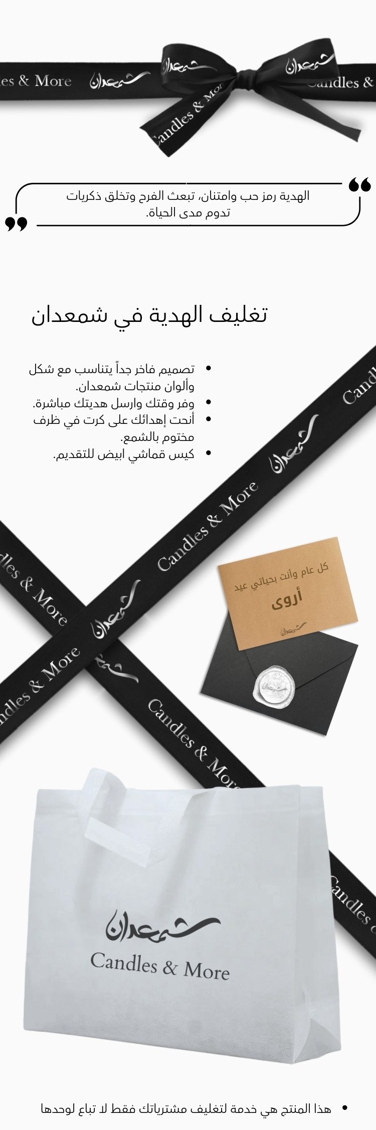 هذا المنتج يوضع في السلة مع مشترياتك لتغليفها كهدية ( التغليف الواحد يشمل كل محتويات سلتك ) لكتابة تفاصيلك اكثر اكتبها في الملاحظات بالاسفل